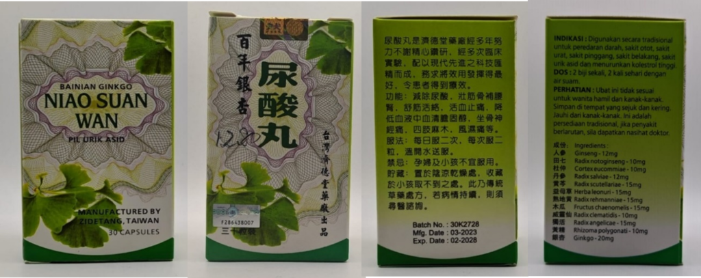Kementerian Kesihatan ingin memaklumkan kepada orang ramai supaya tidak menggunakan satu (1) produk kesihatan seperti tersenarai di bawah. Berdasarkan hasil laporan ujian makmal Bahagian Farmasi, Jabatan Perkhidmatan Saintifik, Kementerian Kesihatan telah mendapati bahawa produk berkenaan mengandungi bahan aktif farmaseutikal yang tidak diisytiharkan, yang dikawal di bawah Akta Ubat Penggal, 285 dan tidak dibenarkan dalam Produk Kesihatan.